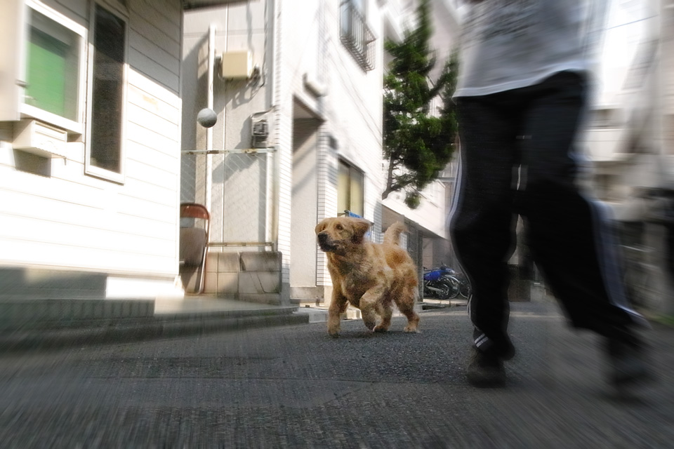 ブローした後,さらに乾かすために家の前でボール遊び。