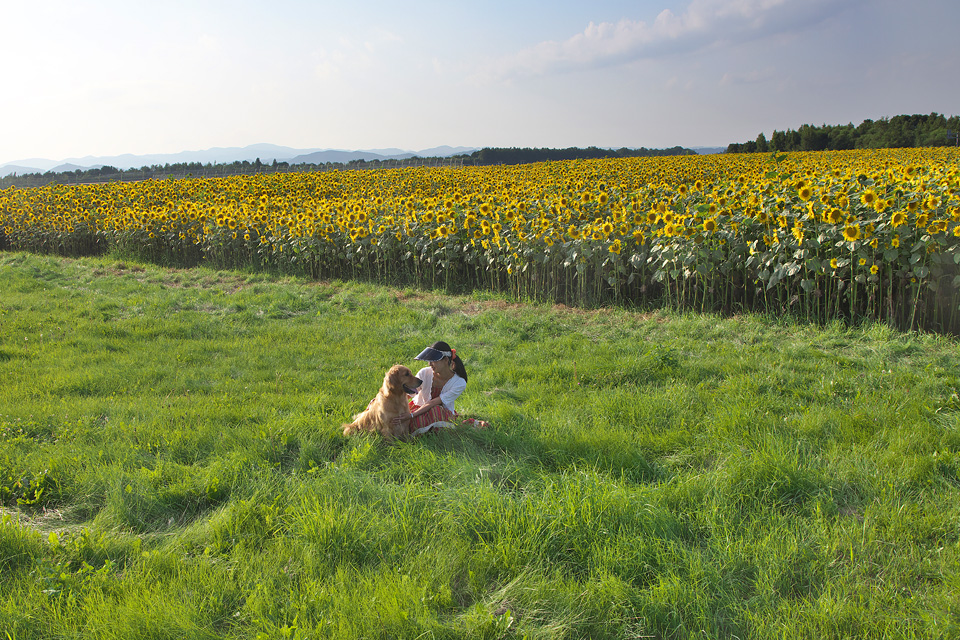 女満別のひまわり畑 タローをとてもかわいがっていた元教え子が4月から網走の大学に通っていたのでアパートまで様子を見に行きますと, 早くも彼女といっしょに暮している気配(笑) 彼がぜひなおみ先生に見せたいと案内してきたのがここでした。