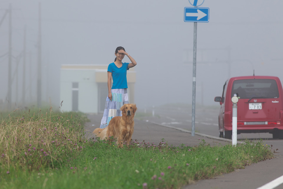 鹿を見つけたので車を降りてほんの数十メートル撮りに行ったのです。 ふだんならボクの横を尻尾ふりふりついて来るところが, 霧で見通しの悪い道路を渡るので危ないと思ってステイ(待て)させたらこの表情です。 じっとボクを目で追ったまま固まっています。早々に撤収せざるを得ません。