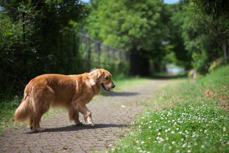 初夏,晴れて地温が高い日には,出社前に職場近くの公園の南口でボクとタローは車を下り, 草地や木陰の多い舗道をゆっくり遊びながら散歩します。 通り抜ける頃にはほら向こうの北口に…いったん出社して掃除を終えたなおみが車で迎えに来ています。 お犬さまです。