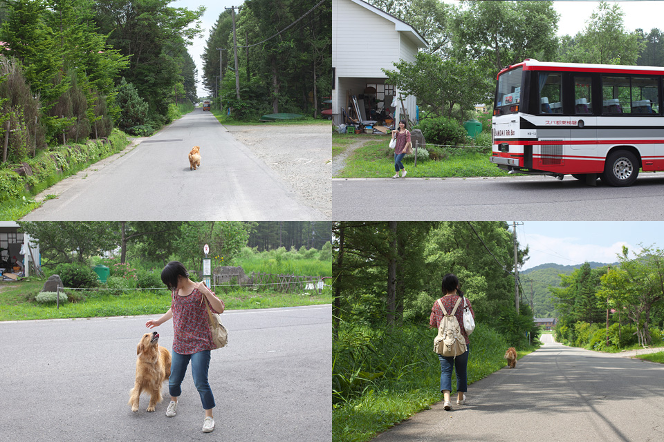 犬は心を読みます。 タローはボクがどこに向かっているかは知りませんが行く手に何かいいことが待っていることは分かっています。 だからずんずん先に立っていきます。 都合で後から電車とバスを乗り継いで合宿に駆けつけたスタッフのマナを迎えに行ったのです。