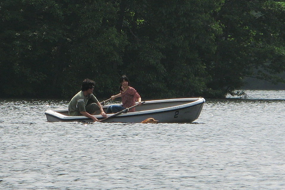 オールをM奈に任せてボクが飛び込み背に乗せて岸まで泳ぎました(岸からゆうが撮影)