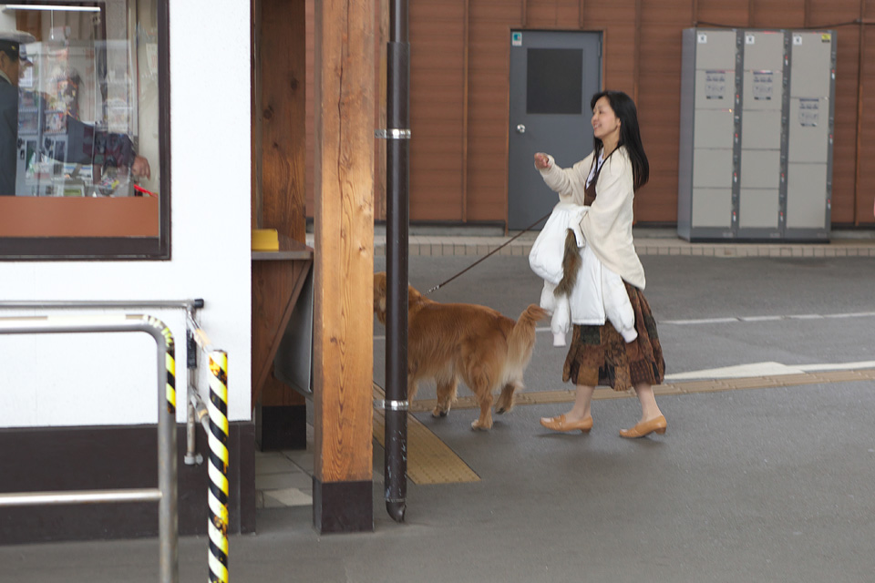 なおみが切符を買ってきてタローと一緒に改札のおじさんに見せています。