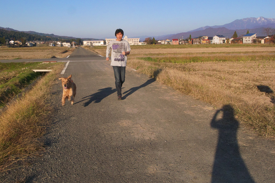ドレミと川遊びしてきたタローがなおも遊びをせがむので筆を休めて駆けっこしました。