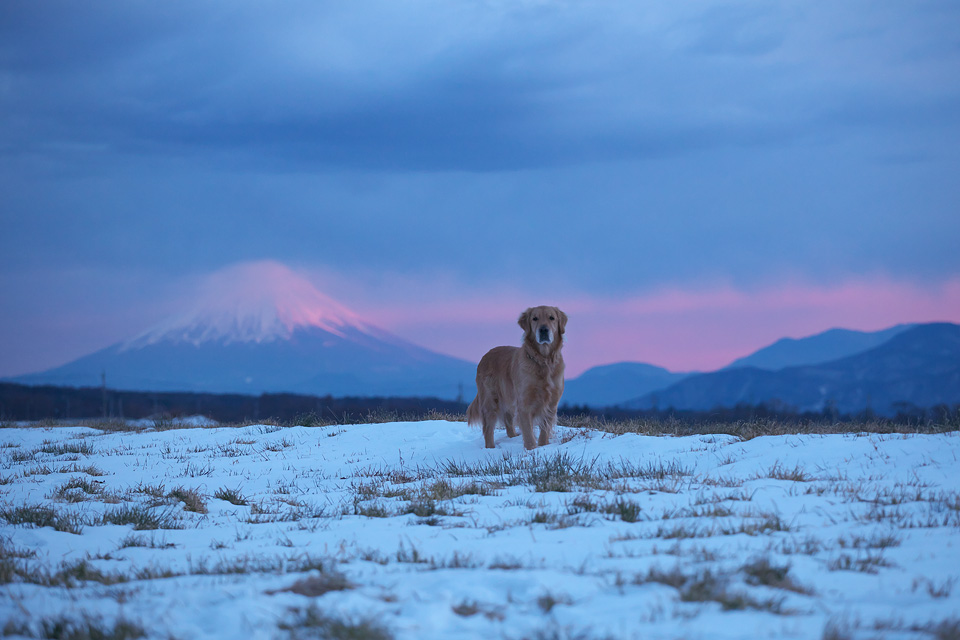 タ元日の夕富士を撮りに出たとき「すぐだからママと留守番してていいよ」と言ったのに付いて来たタロー。