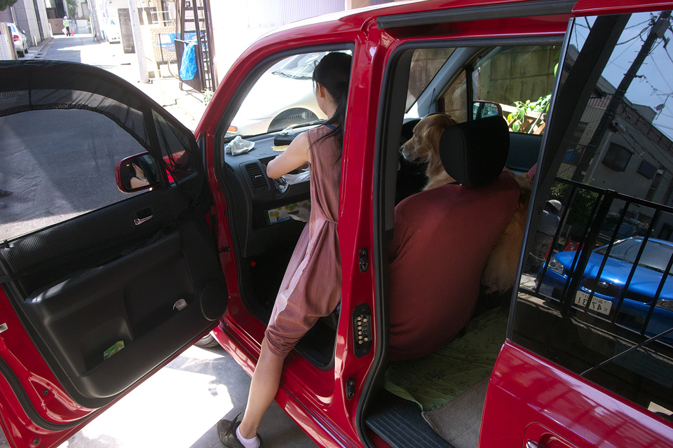 解説しますと車の車内清掃をしているのをお出かけと勘違いして定位置に座ってます。
