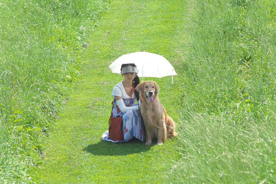 なおみが腕にしているのは500円で買ったドライバー用日焼け防止グッズです。 タローを連れ,ちょっぴり誇らしげに胸を張って歩く彼女を見ていると, カー用品の手袋や折り畳みの日傘がボクにはなんとも優雅に見えてしまうのです。 北黄金貝塚にて