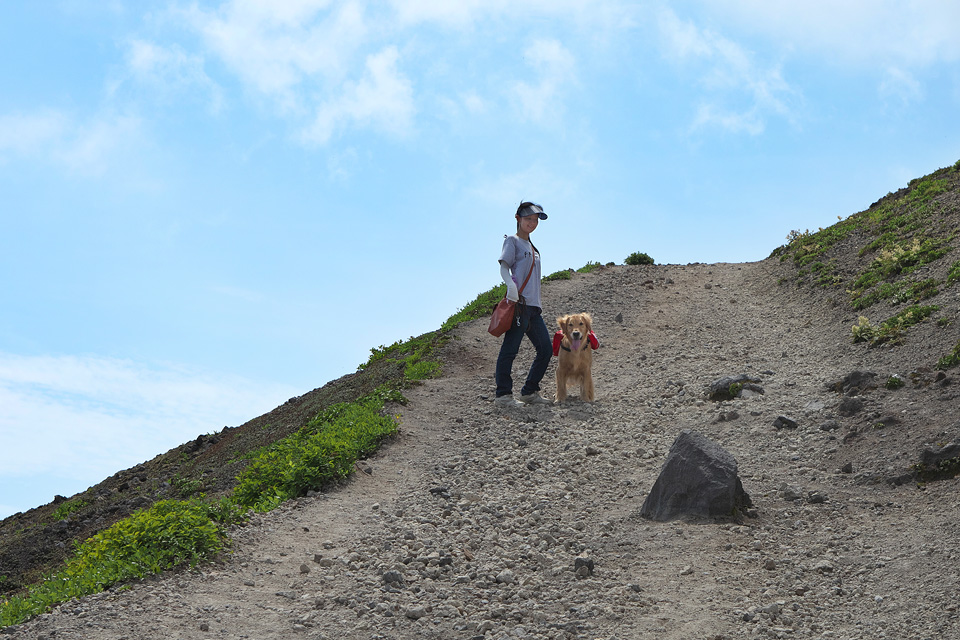 「ねえ、やっぱり引き返しましょう。」 力ない足どりを見てなおみがそう言うと、帰りたくないのでしょう、タローは急に元気をアピールしました。 先頭に立って登って行きます。やがて森林限界を過ぎ稜線に出ました。