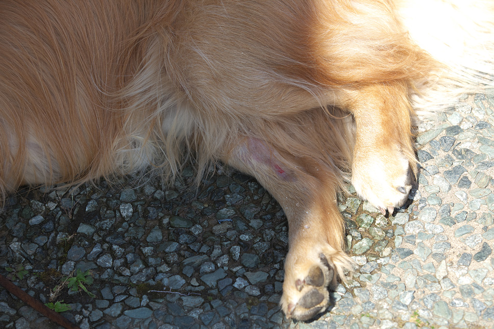 神威岬の歩道には梯子場もあり。 タローは放せば他の崖を行くのですが,観光地ではそうもいかないのでボクが担いで上り下りしました。 気づくとどこかの岩場でケガをしたみたいです。 なおみは薬箱をひっくり返して大騒ぎをしましたがタローは平気な顔。
