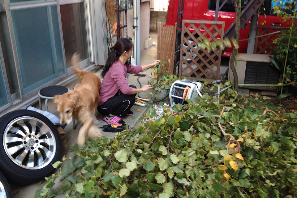パパはスタッドレスタイヤへの交換作業,ママは落とした枝の整理