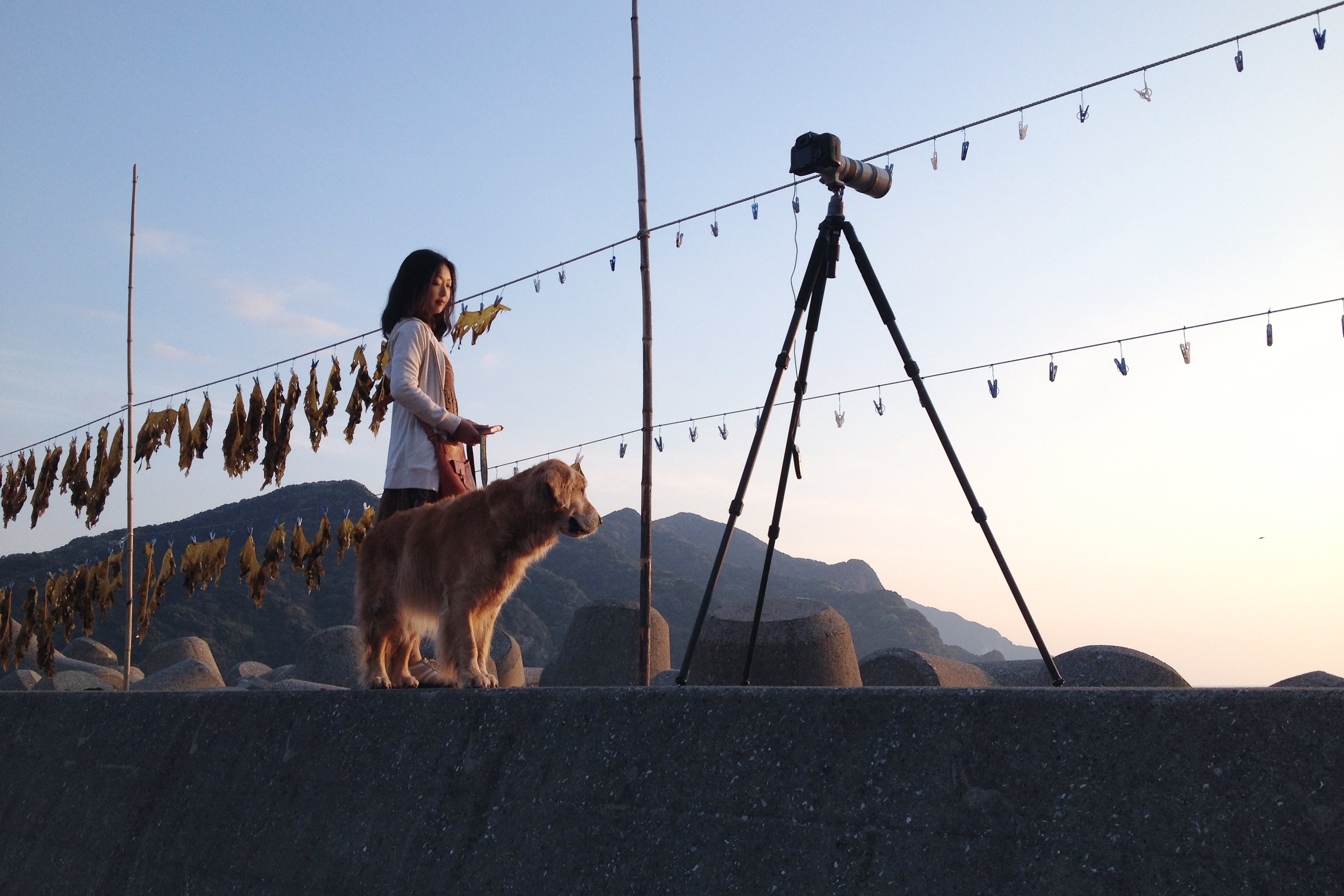 崎津にて「海に祈るマリア像」撮影中…漁港の岸壁で1時間くらい夕日を待ちました。