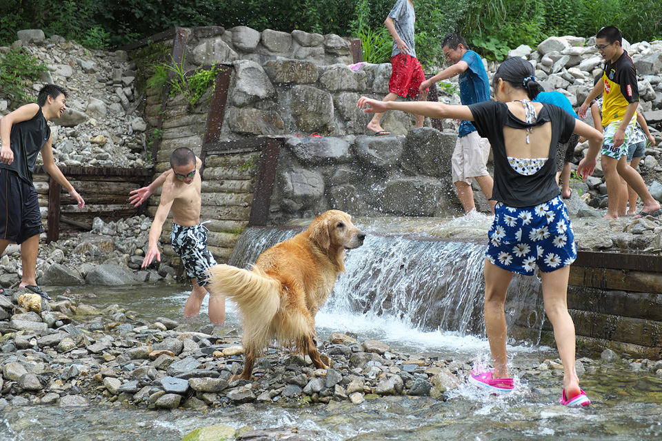 みんなを川遊びに案内してます。