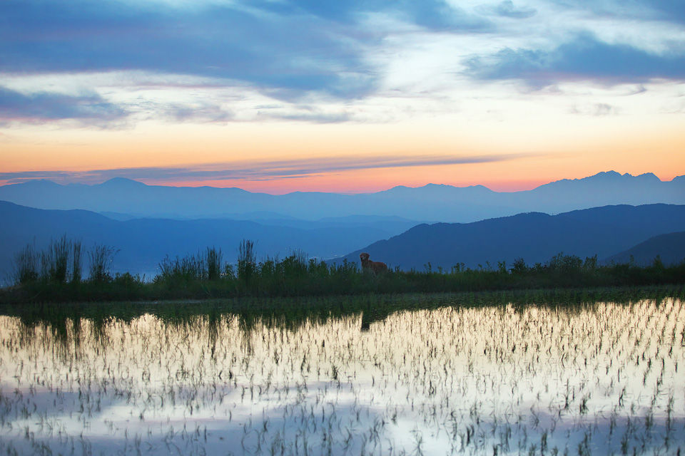 もっと右だ左だと指示されるまま,夕日を背景にシルエットのモデルをする。
