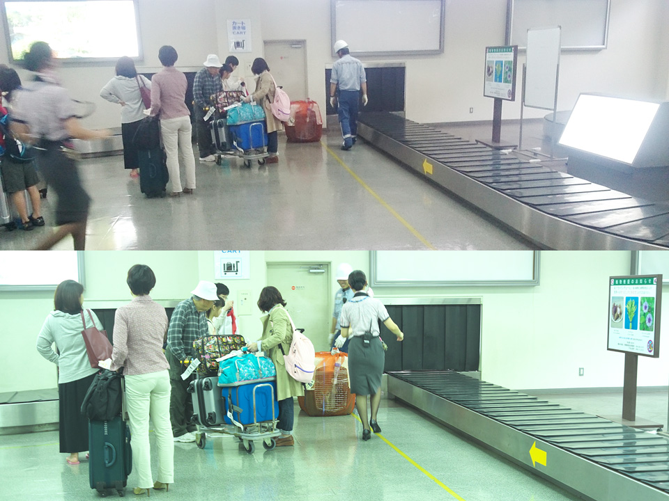 バゲージクレームの奥からタローのケージが出てきました。なおみが駆け出しましたがそれより早くANAの職員が駆け寄ります。