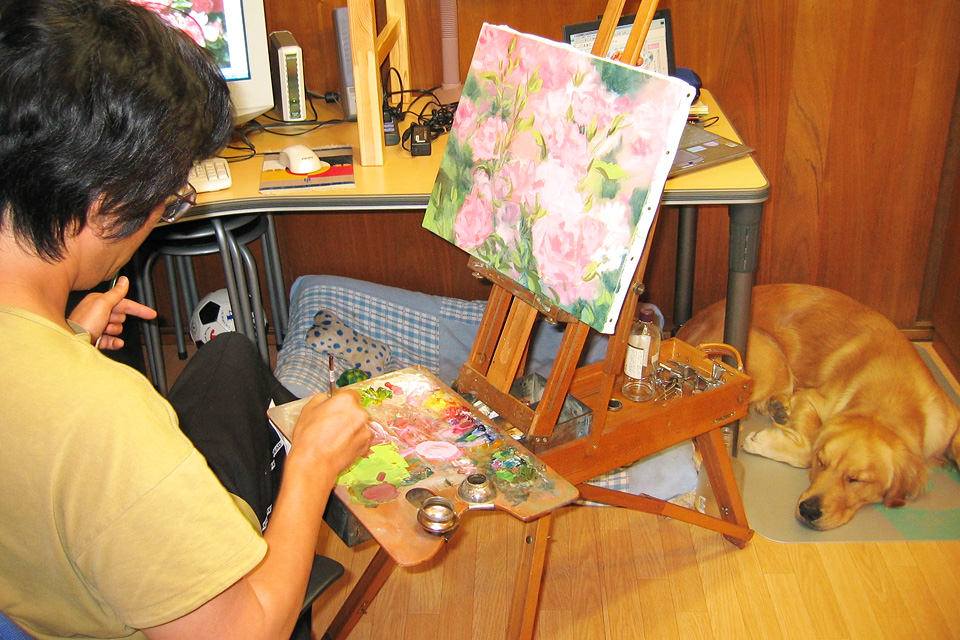 バラ園で撮って来た写真を見ながら早速油絵に…。