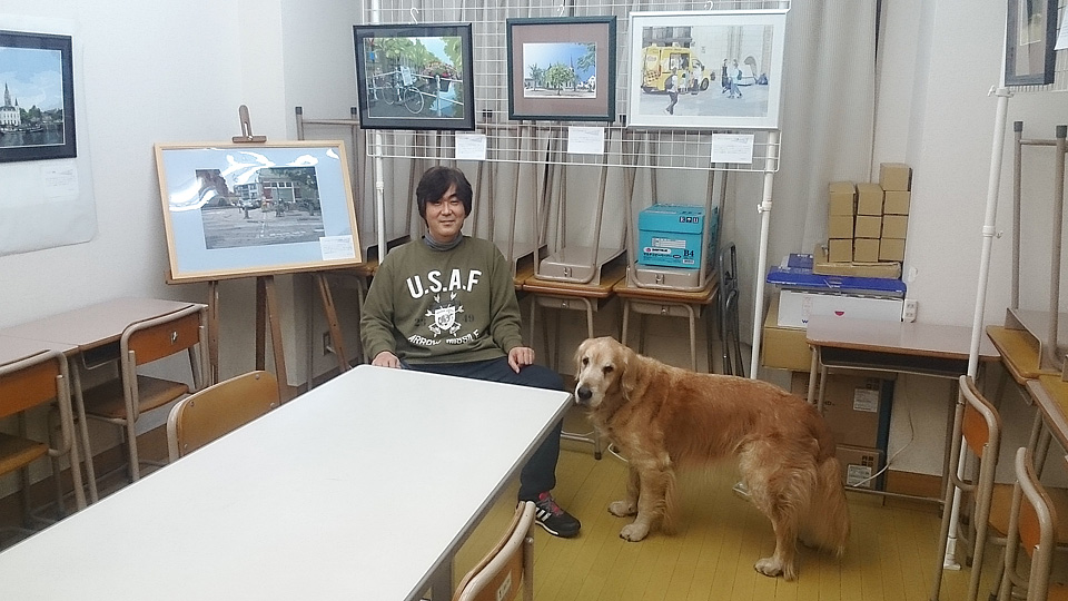 おっと練習の迫力に圧倒されて,同時開催の個展会場設営中のボクのところへやってきました。