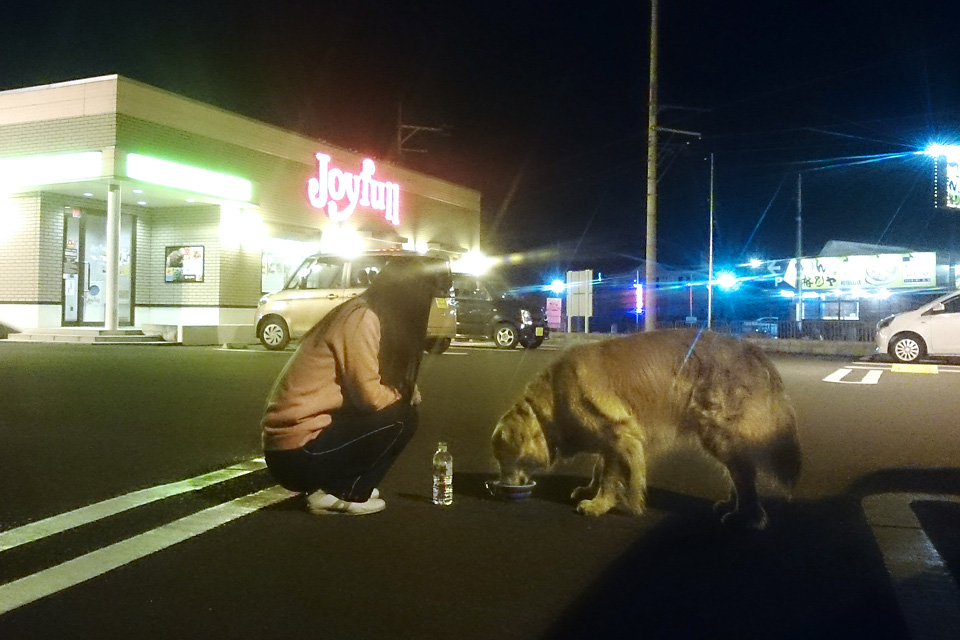 真っ暗になってから下山し,タローの夕飯はファミレスの駐車場。