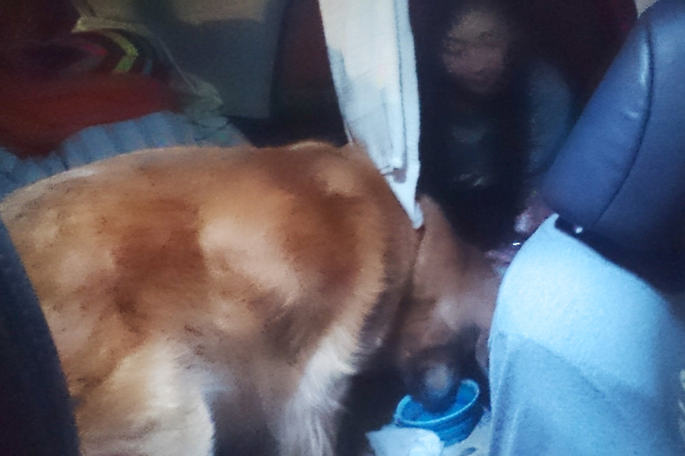 雨の夕食。タローが濡れないよう,自分は氷雨にあたっても車の中で与えています。