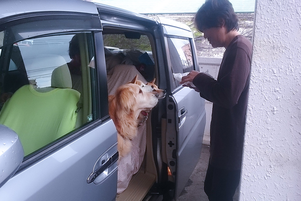 函館五島軒の駐車場,留守番していた犬たちにパンのお土産です。