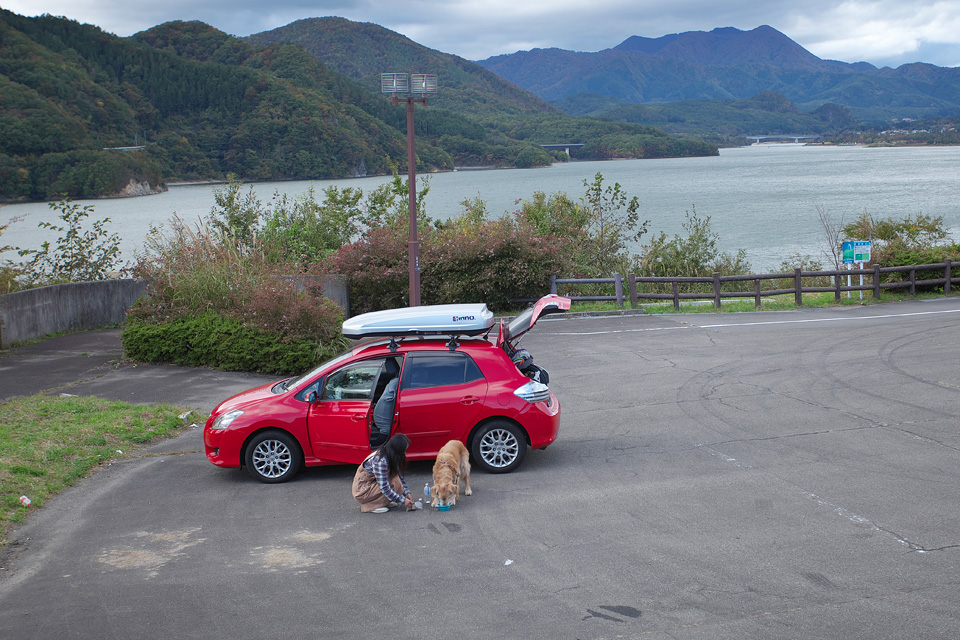 タローのごはんは一日三食に分けていました。 タローはごはんが大好きだったからです。 二食より三食の方が楽しみが1.5倍です。 どうせ24時間いっしょなので手間はさほどかわりませんし, ごはんを食べているタローを見ているのは幸せでした。 白石川七ヶ宿湖にて
