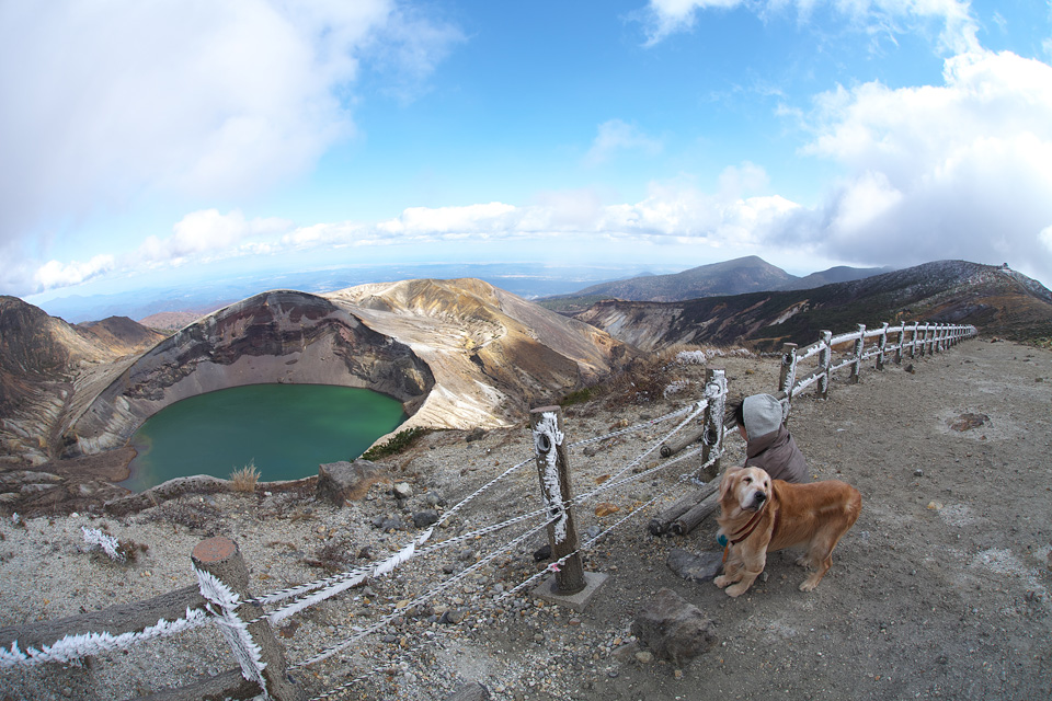 蔵王の山頂です。あまりの強風で二人とも宙に浮きそうです。