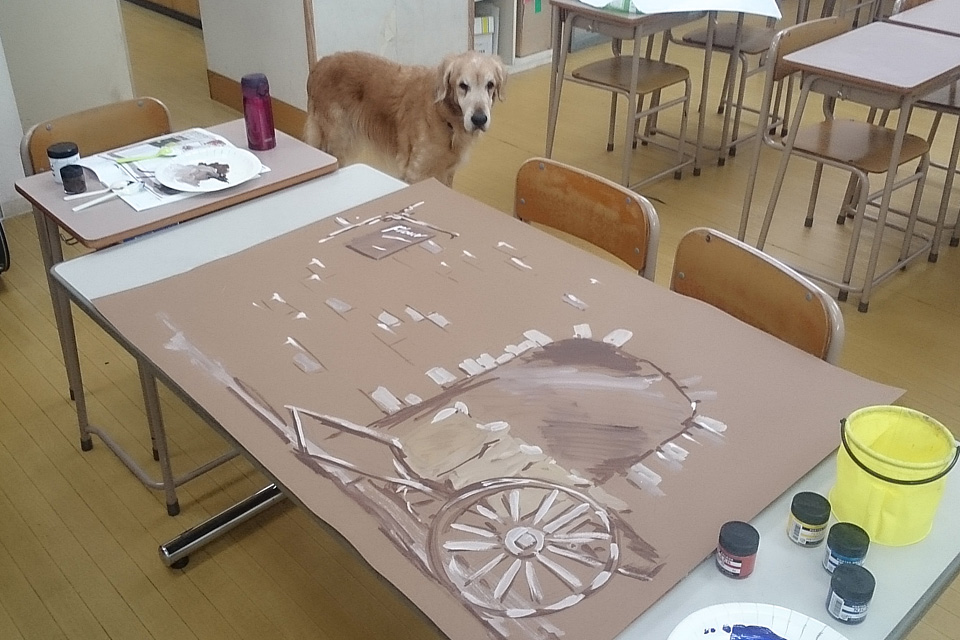 制作途中のこの書割,七ひきの子ヤギのオオカミが粉を買いに行く粉屋さんです。