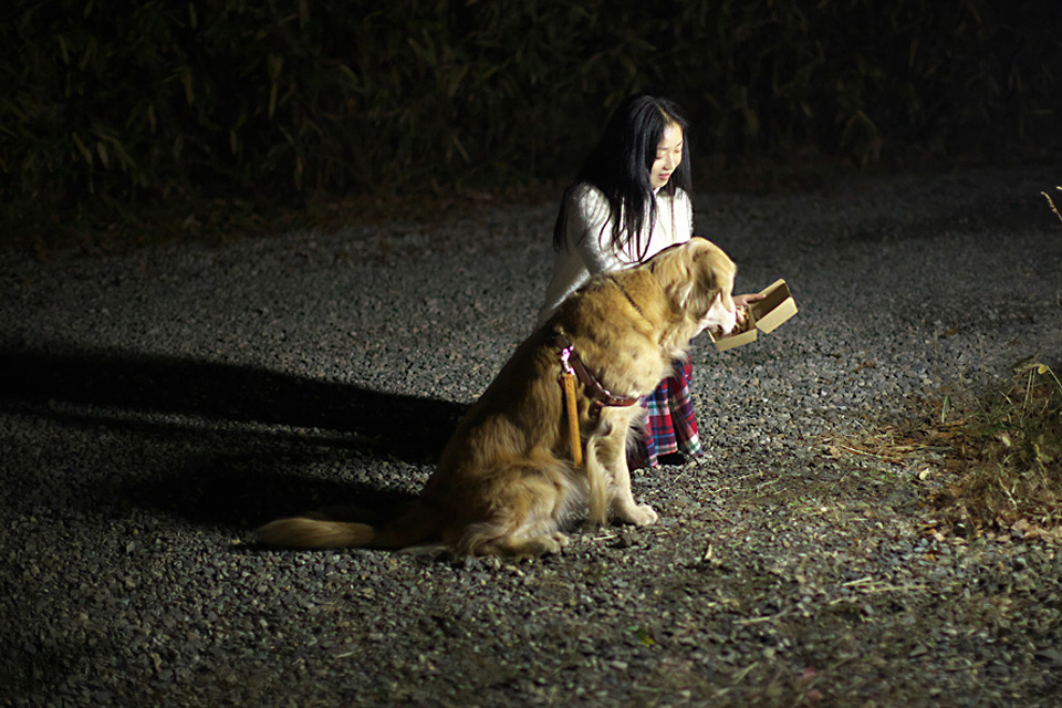 コンサートがはねて…タローにパーティのお肉のお土産です。