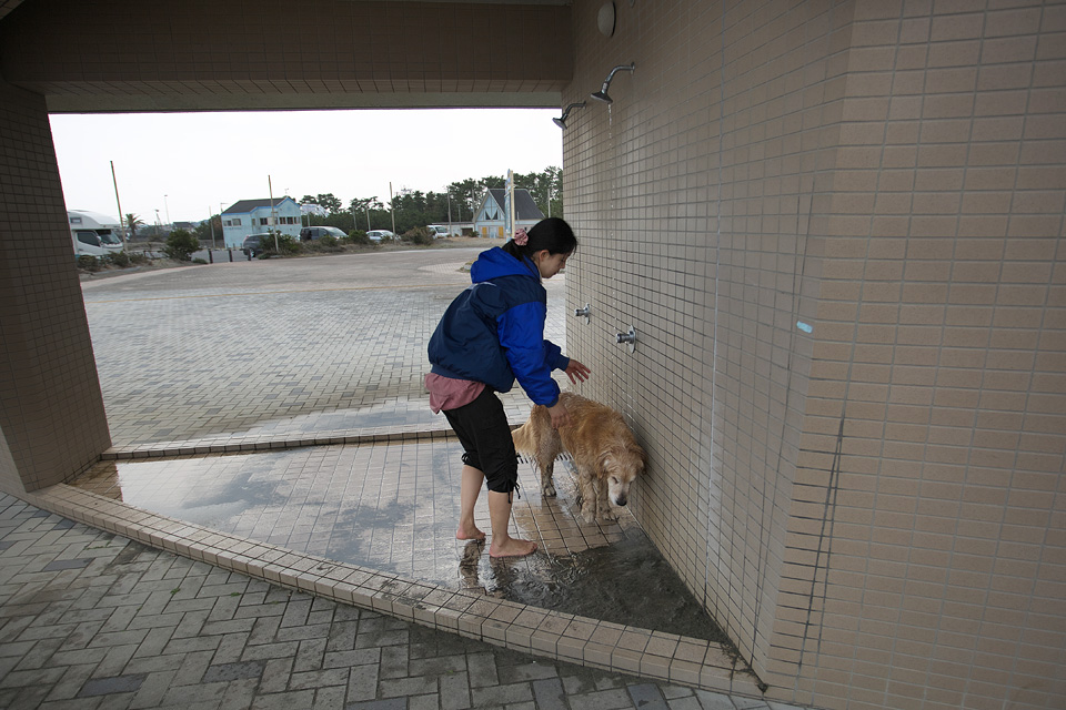 はるまだ浅い3月初め,水のシャワーもタローのためなら裸足です。