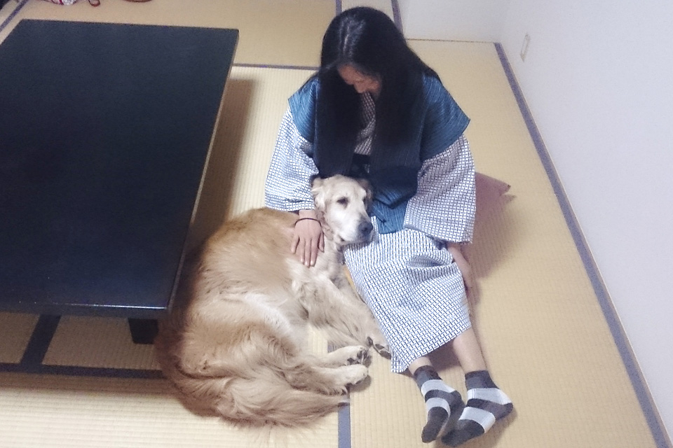 お部屋で寛ぐ。プール楽しかったね,タロー。