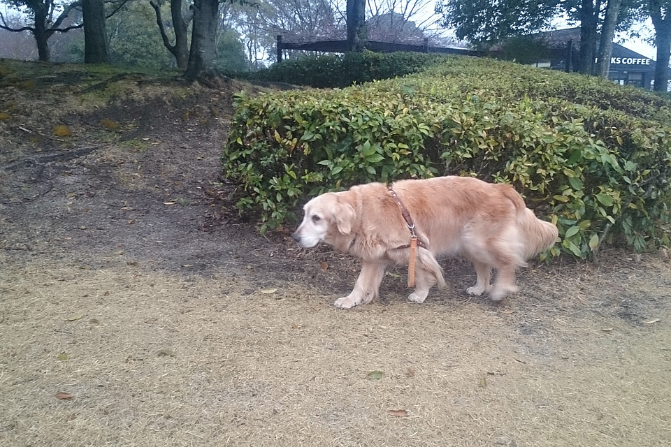 雨のときのワントゥ 小用は植え込みに放せば自分で奥の方へ行ってしてきます。