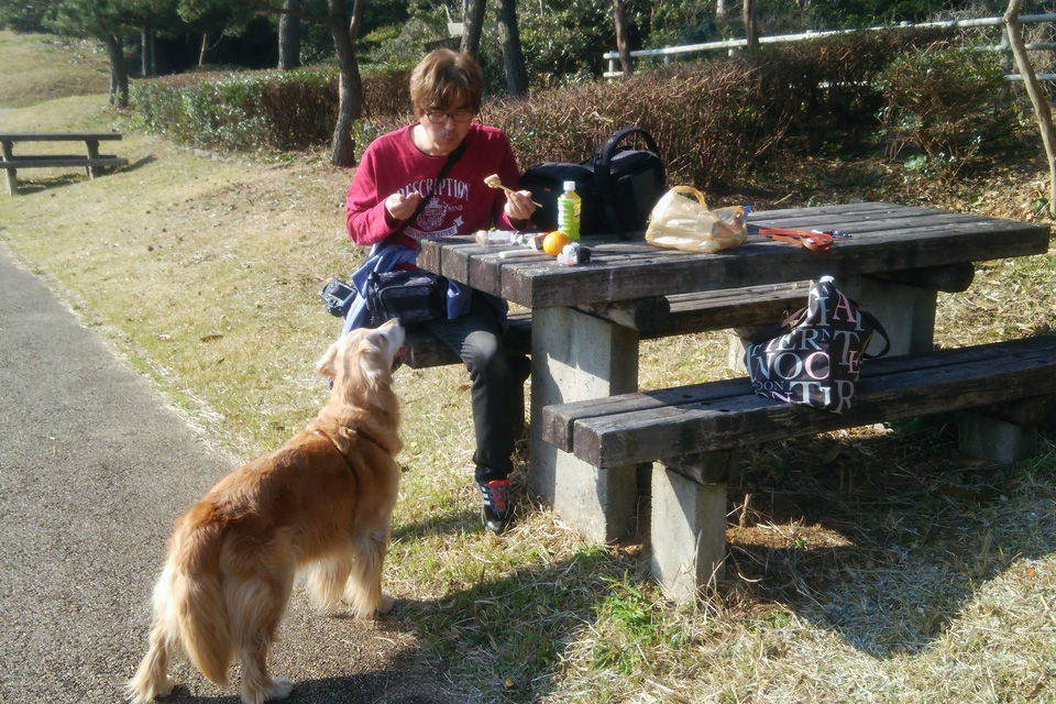 朝には七ツ釜に下る丘で朝食中です。