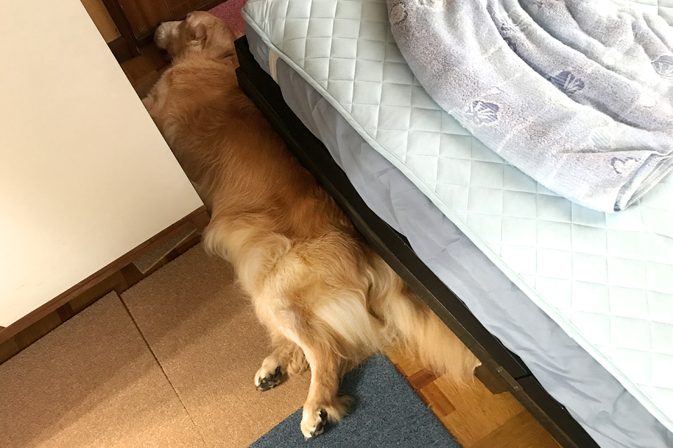 少しでも冷たい床を探して移動していくのでどこに寝ているかわかりません。