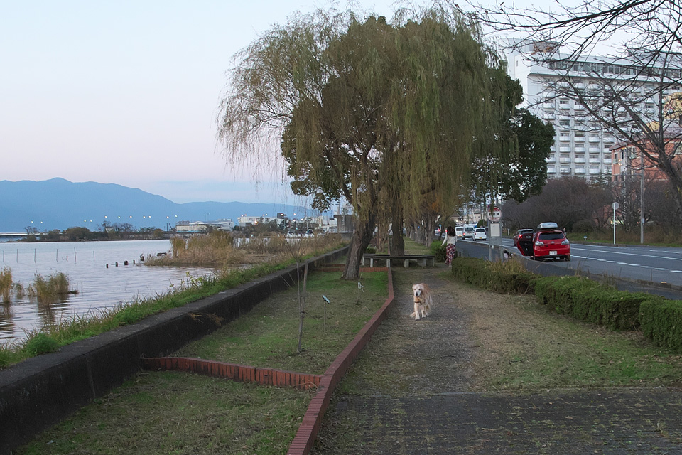 琵琶湖畔…夕景の撮影中,ふと気づくと足許にいたはずのタローがずっと向こうから一生懸命よろよろと走ってきます。 何をしていたと思いますか?体の具合が悪いのにボクが撮るための水鳥を探していたのです。 葦原に白鷺を見つけて急いで報せに来るところです。