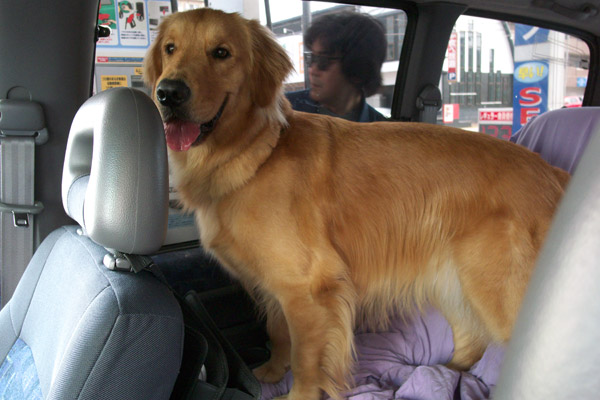 シュウが外で何かやってるよ。ボクも外に出たいなぁ。…ガソリンスタンドにて