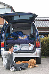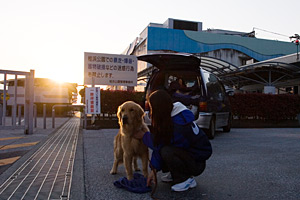 浦戸大橋(無料化していた)を渡って海沿いの黒潮ラインを東に向かった。高知市を外れた頃に,通勤渋滞に巻き込まれてしまった。夜明けの桂浜でたたき起こされたママとタローは爆睡に入っている。