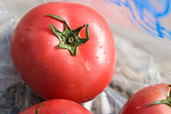 「なんで起こしてくれなかったのよぉー。いいのはほとんど売り切れ。お一人さま3袋限りのトマトだけほら♪」