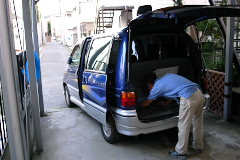 また、4駆ワゴン車の床面は意外に高いのです。路肩に寄せて、タローが降りるときなど、ほとんど、逆立ち状態で前足をつき、体を空中で90度回転してます。乗るときも助走できないので、一気に座面までジャンプしたりしてとても危険です。もちろん、毎回36kgを抱きあげるわけにもいきません。