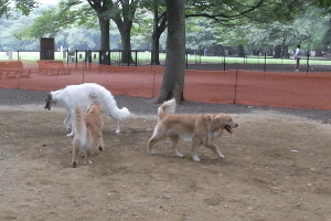 暑くならないうちに遊ばせようとするのはみんな同じらしく、朝のドッグランは大型犬のラッシュ。