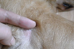 タローの右ひじに異変。直径1cmほど毛が抜けて皮膚が赤い。