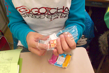 タローの写真を包み紙に印刷したチロルチョコをみんなに配った。 ぱくぱくぱくっと食べて,包み紙はくしゃくしゃに袋につっこんだT成。
