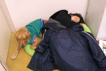 ゆうべから微熱のあったなおみ。 きょう,出勤の頃から急激に症状が悪化した。 夜の授業に行こうとしたとき貧血を起こし,事務室にあるタローのハウスに倒れこんで動けなくなった。