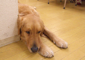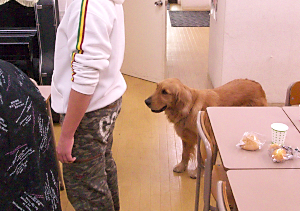 お別れ会の式典の間,廊下に出しておいたら,「ボクも入れろ」と,ドアをがしがし。みんなの間に座ります。