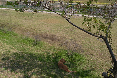 仕方ないので,ボクも木陰に腰を下ろして,煙草に火をつけます。ときどき,そよそよと風が川を渡り,ボクとタローに花吹雪を降り掛かけるのです。