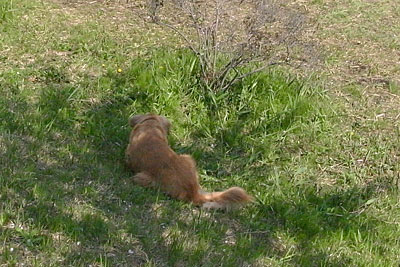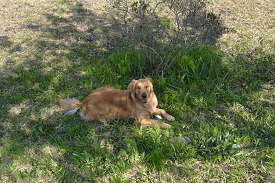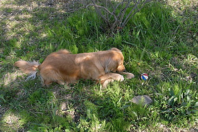ところが2,3投すると,ボールをくわえたまま,桜の木陰にへたりこみます。