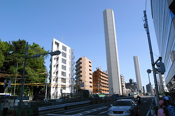 山手通りを渡ります。最近,こんな塔が立ちました。地下に建設中の首都高速環状線,新宿~渋谷間の完成も間近のようです。