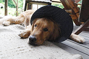 と,言えば「しまった」という表情で直ぐにやめるのだが,その一掻き二掻きで,せっかく乾いていた傷口がまた血だらけになってしまう。山でエリザベスカラーはいかにも不憫なので,古い靴下を履かせ,帽子も被らせた。