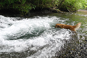 梅雨真っ只中で,いつもの淵はかなりの水量と流速だが,タローはものともしない。淵への往復もぴょんぴょん跳ねるようにはしゃいでいる。