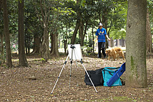 ボクは夏のシミュレーションのスケッチをする。持ち物に椅子とイーゼルを加え,代わりにレンズを一本あきらめた。この道具立てならば絵はまあまあだが,蚊が集まってくるのには閉口した。携帯蚊取り器と虫除けスプレーが必要だ。それからカメラバッグを地面に置くためのシートも。
