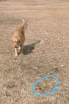 東京は14℃だって。タロー、フェッチ! あれ?地面に鮮やかな黄色。