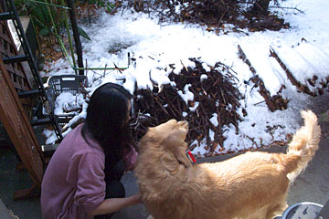 おとなりのちびっ子二人は、ゆうべ遅くまで夢中になって雪遊びをしていましたが、ぜいたくにも八ケ岳のパウダースノー遊んできたばかりのタローはちっとも雪の庭に下りようとはしません。一週間前の粉雪の日はけっこうはしゃいでいましたのに…。思うにタローの基準では、このような湿り気の多い状態は、たとえ白くても「雪」ではなく「雨」に分類されているのではないでしょうか。